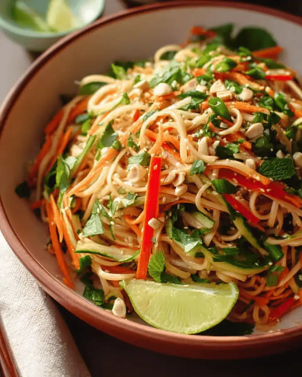 Elevate your Asian Noodle Salad by serving it in a vibrant bowl garnished with chopped cilantro, sliced lime wedges, and a sprinkle of roasted peanuts. Consider layering the ingredients for a visually appealing dish — place the colorful veggies on top of the noodles and dressing for a fresh look. Use chopsticks for an authentic touch, encouraging a fun and interactive dining experience. For a more festive occasion, serve individual portions in small clear cups, allowing guests to see the colorful layers.