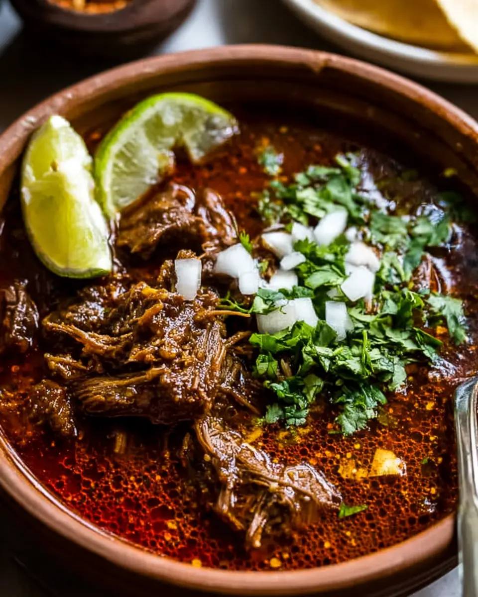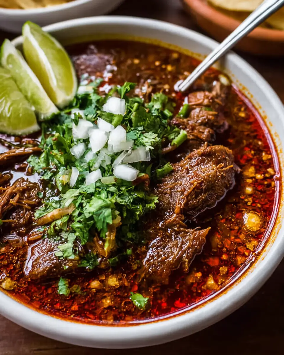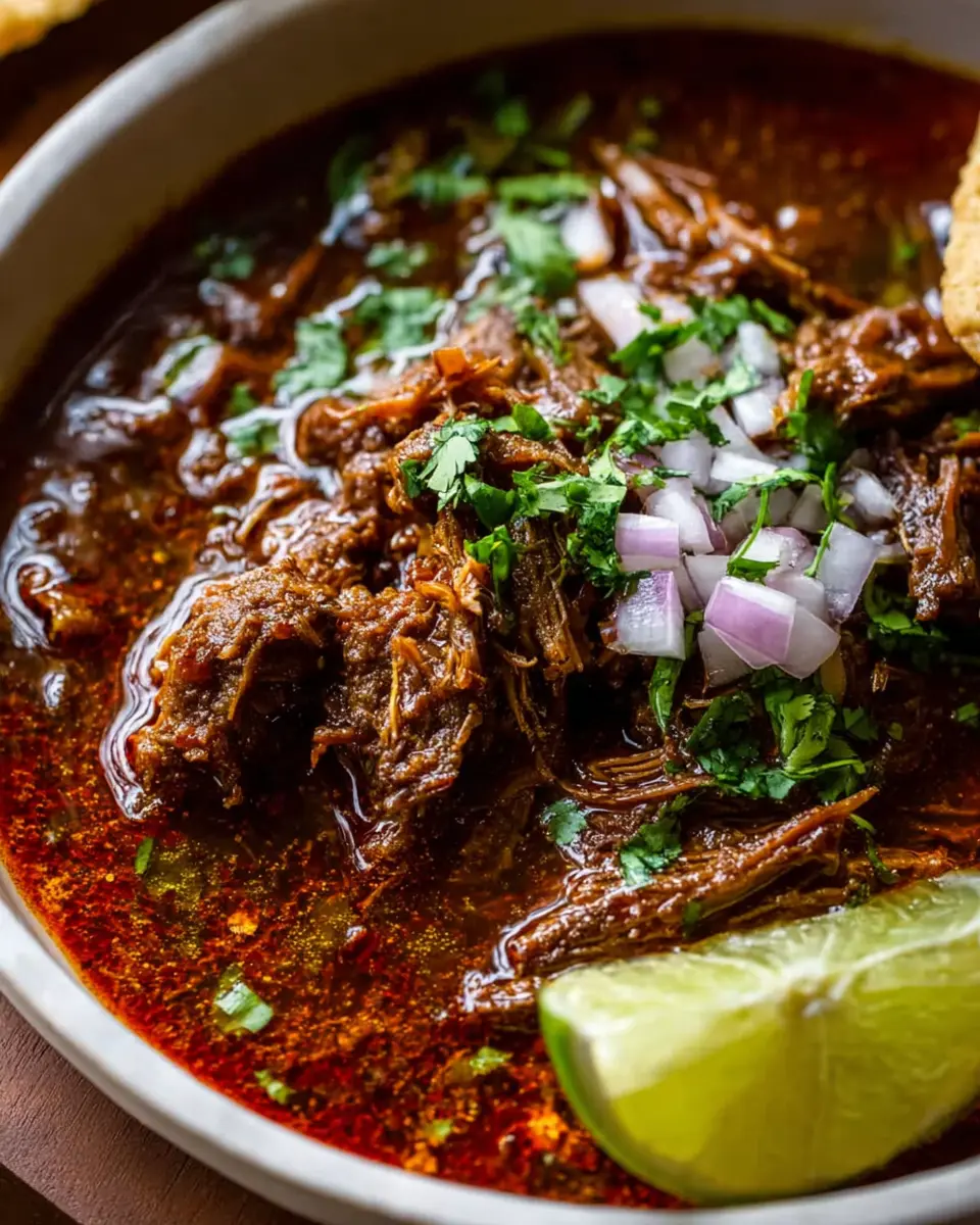 When finished, shred the meat with two forks and combine it with the tasty broth. Serve it warm in bowls or as tasty tacos. Whether you garnish with diced onions, fresh cilantro, or a squeeze of lime, your authentic birria will be a hit at any dinner table!