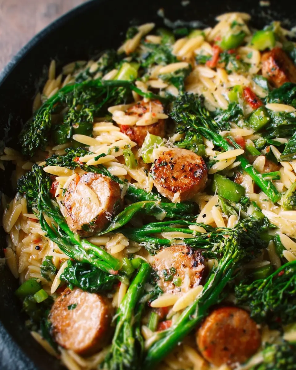 Not a fan of chicken sausage? No worries! You can swap it out for turkey sausage for a leaner option. Shrimp is another fantastic choice, bringing in a delightful sweetness. For a vegetarian twist, try using cubed tofu or tempeh; both are excellent sources of protein and add a satisfying texture. Each variation provides a new flavor profile, making your Broccolini Chicken Sausage Orzo skillet a versatile dish that fits any dietary preference. Add your favorite seasoning, and you’ve got a winner!