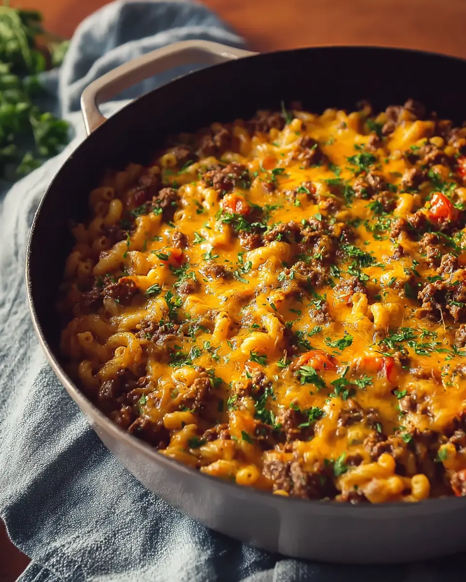 Remove from heat, garnish with fresh parsley, and your Cheesy One Pot Hamburger Casserole is ready to be devoured!