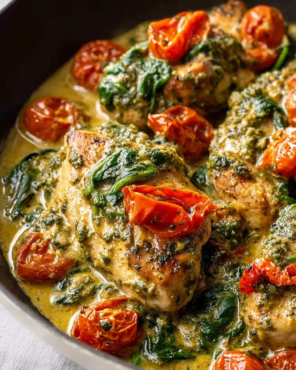 Creamy Pesto Chicken with Roasted Tomatoes & Spinach
