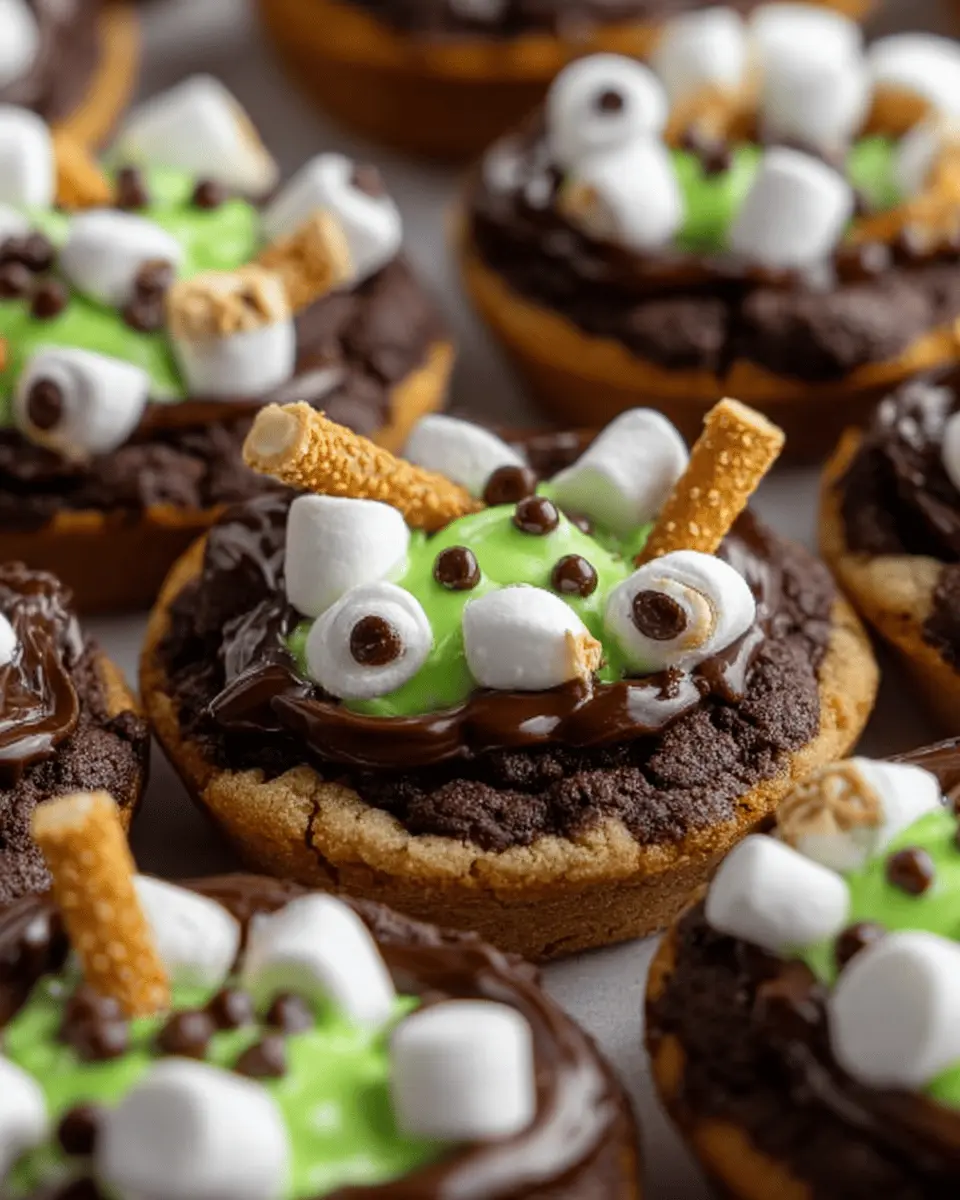 - Decorate with green sprinkles, candy eyeballs, and Halloween sprinkles. Break pretzel sticks in half and insert one into each cookie cup as a stir stick.