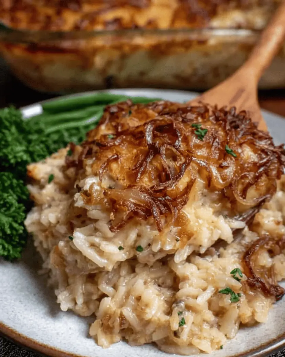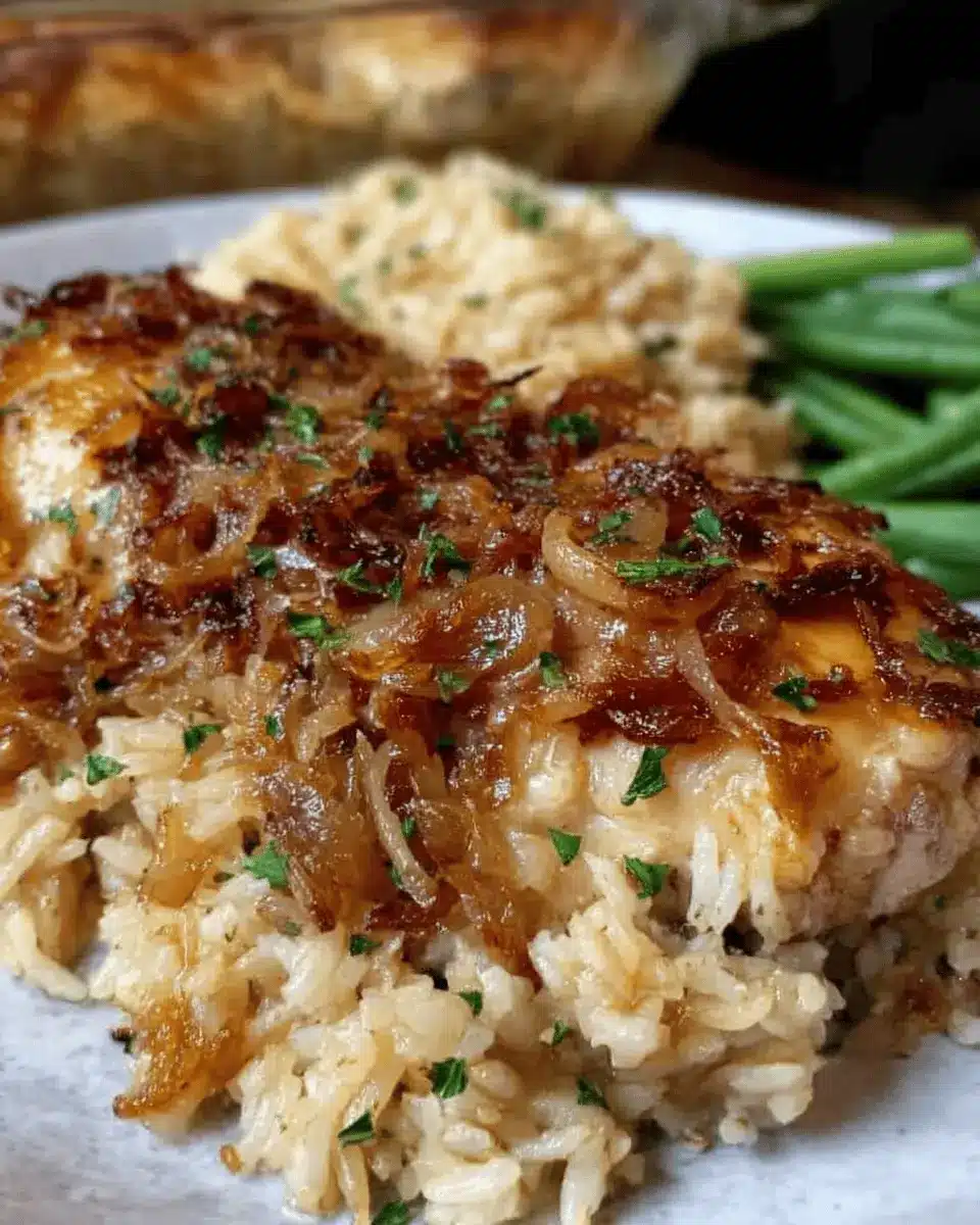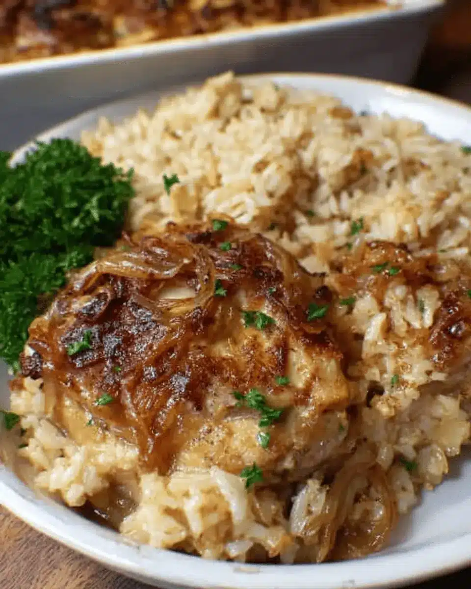 In summary, the French Onion Chicken and Rice Bake is a delightful dish that combines the rich flavors of classic French onion soup with tender chicken and perfectly cooked rice. Ideal for busy weeknights, this recipe offers comfort and convenience in one delicious package. Give it a try for your next family dinner!
