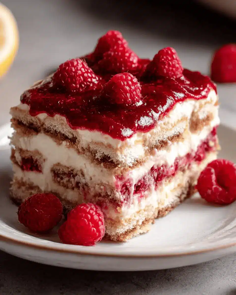 Cover your assembled tiramisu with plastic wrap and let it chill in the refrigerator for at least eight hours, or ideally overnight. This allows all those amazing flavors to meld beautifully. When you’re ready to serve, top with the remaining raspberry jam and decorate with fresh raspberries and slices of lemon for that extra pop.