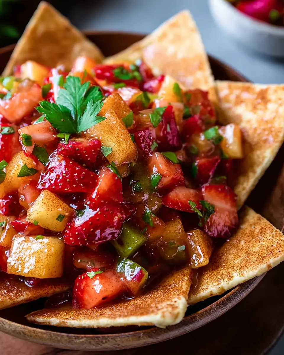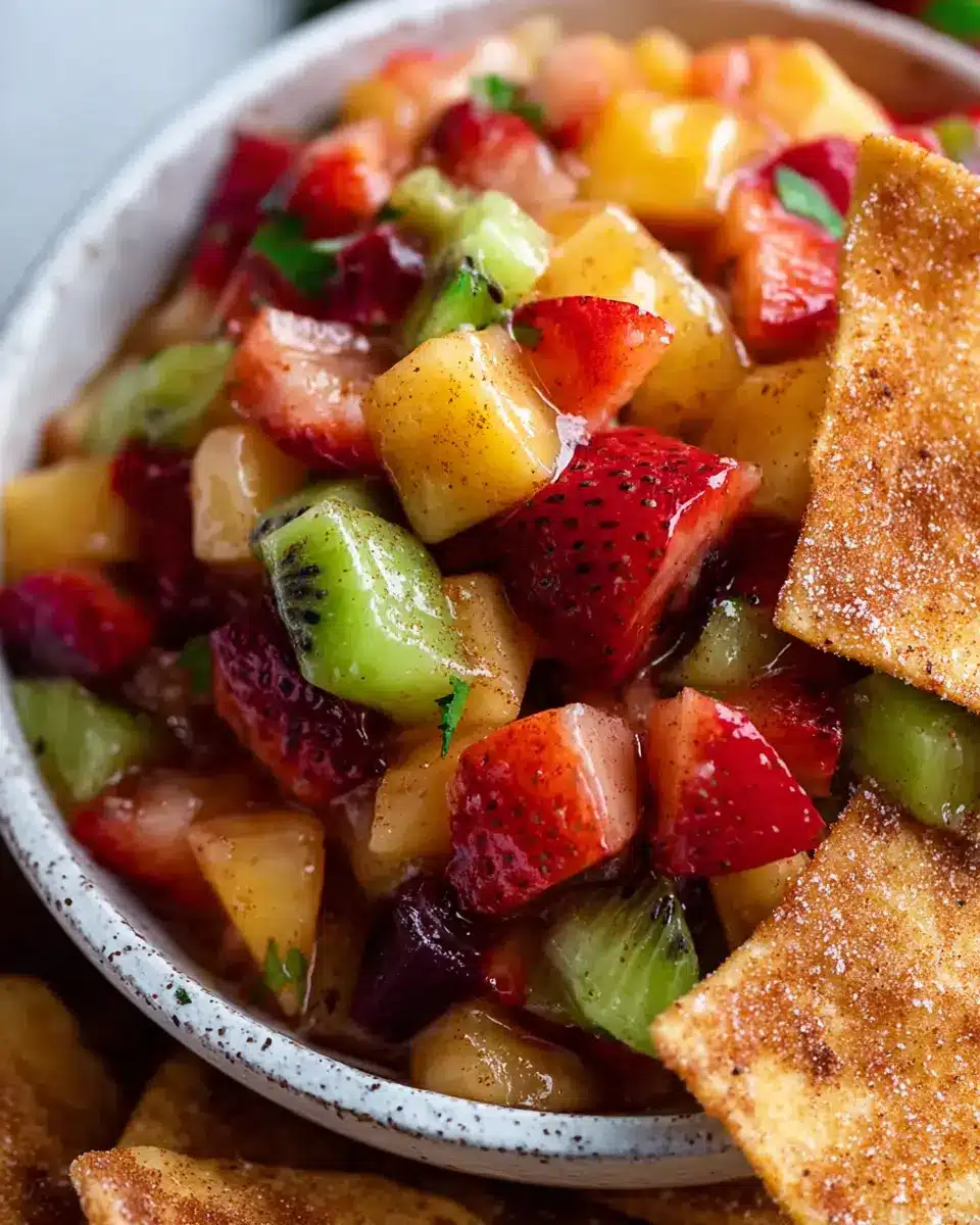In summary, fruit salsa with cinnamon sugar chips is a delightful treat that brings brightness to any gathering. It combines the sweetness of fresh fruit with the irresistible crunch of cinnamon-sugar tortilla chips. Easy to make and fun to eat, this dish will surely be a crowd-pleaser at your next event.