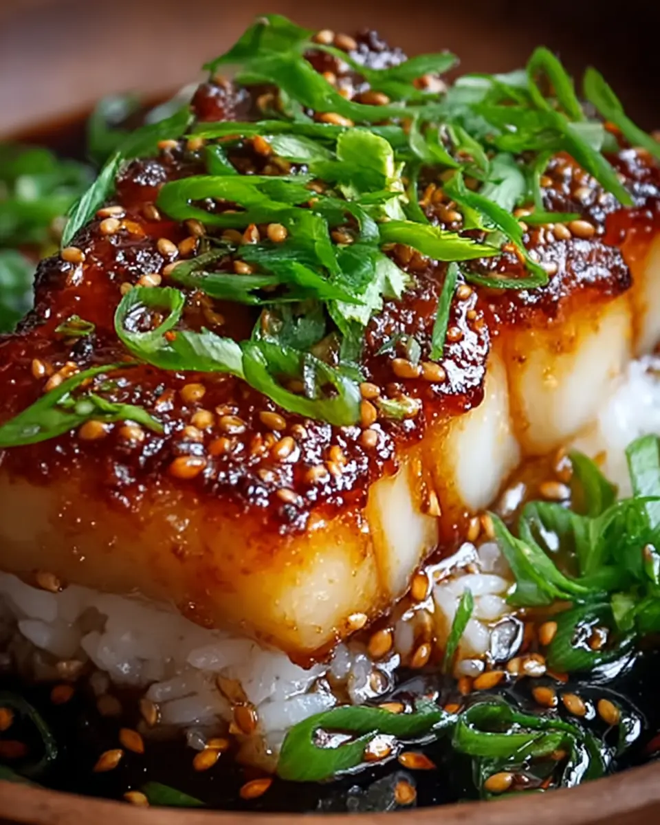 The final step is where you’ll add the finishing touches. Spoon the thickened glaze generously over the cooked cod fillets, allowing it to cascade over the fish. For that gourmet touch, garnish with sesame seeds and chopped green onions.