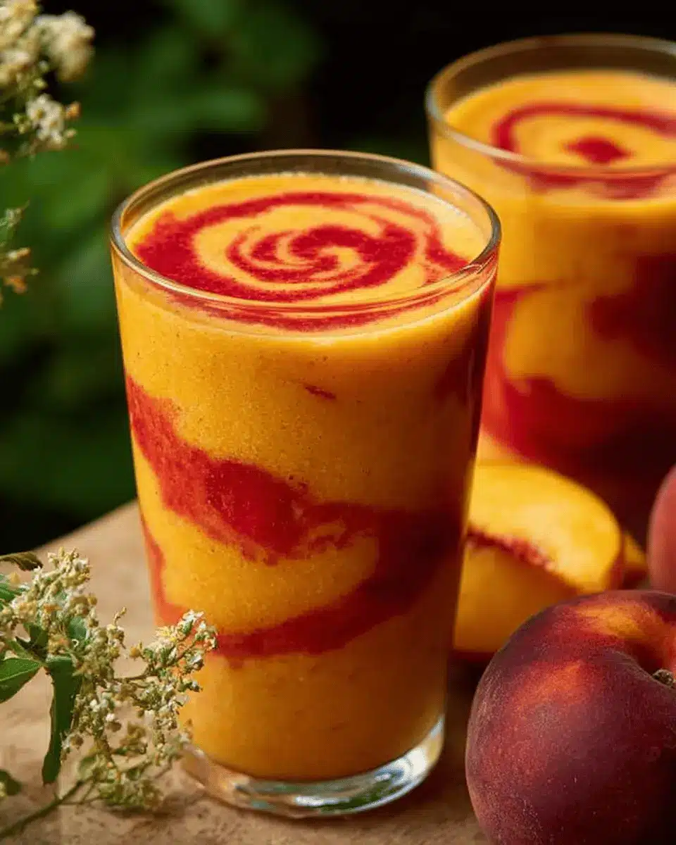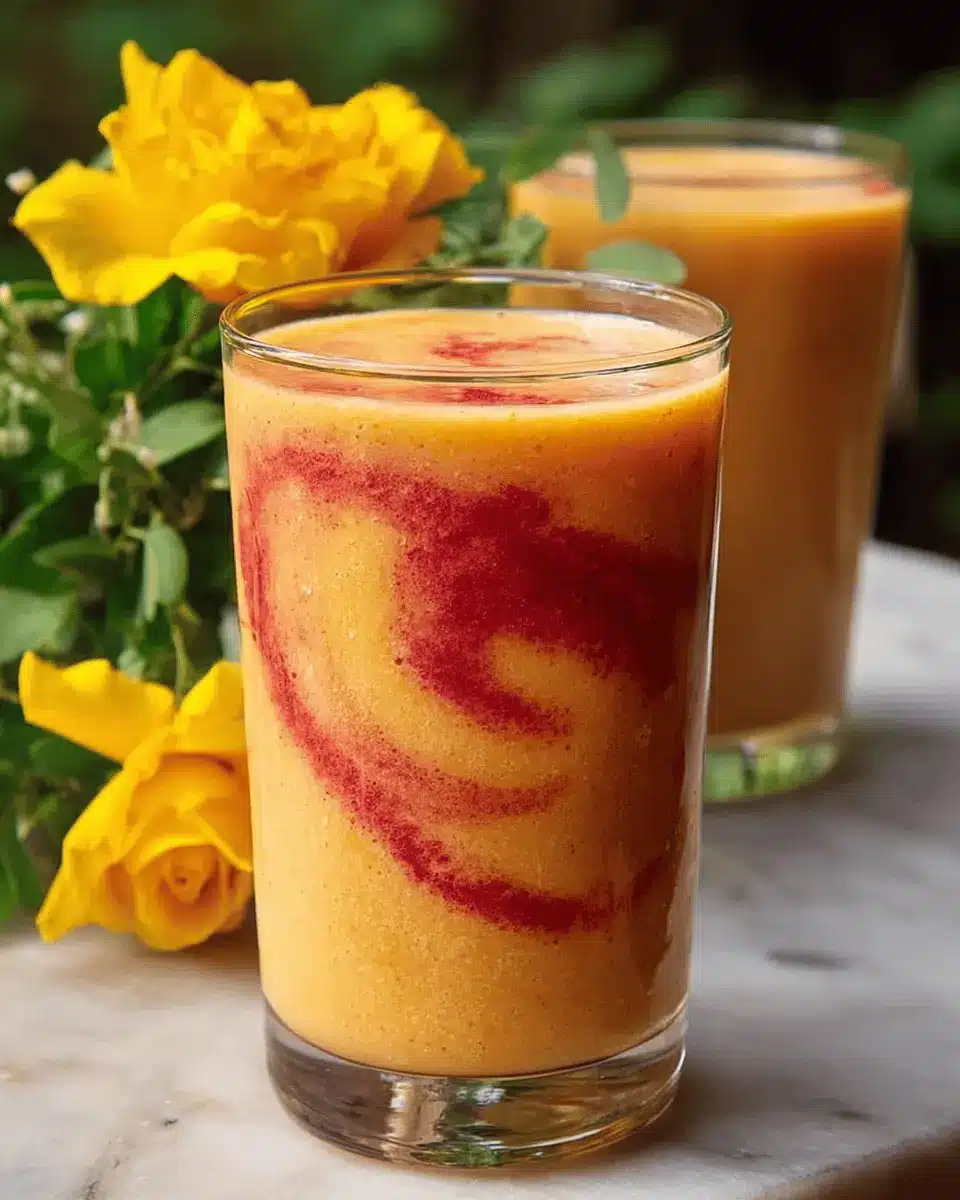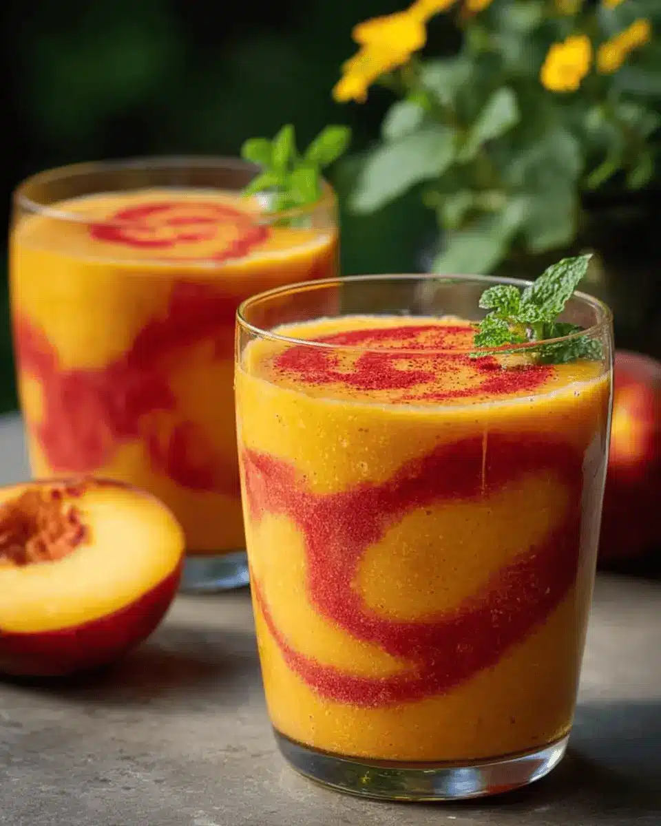 Now for the best part—serving! Enjoy this golden sunrise in a glass right away. The combination of creamy sweetness from the peaches and the tangy raspberry layer makes for a refreshing treat that’s perfect for breakfast or a mid-afternoon boost. Share it with friends or savor it solo while you take a moment for yourself. It’s not just a drink; it’s a burst of sunshine on a busy day!