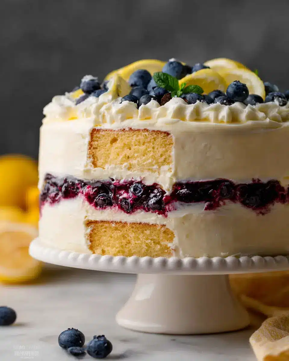 For a show-stopping finish, consider garnishing with extra blueberries or a slice of lemon. Once assembled, refrigerate the cake for about 45 minutes to set before slicing and serving. Trust us; it’s worth the wait!