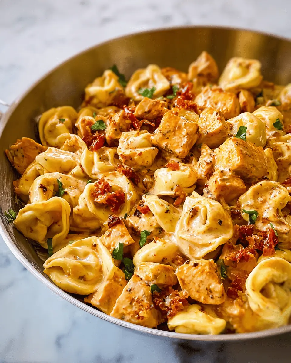 At this point, your water should be boiling! Toss those cheese tortellini in and cook until tender, about 3 to 5 minutes (they should float!). Once done, drain the tortellini, saving about a cup of that cooking water. Now combine the tortellini with the creamy sauce, adding the cooked chicken and turkey bacon, and ensuring everything is coated in that rich sauce. If it looks too thick, don’t hesitate to add a little of that reserved cooking water until you achieve a luscious consistency.