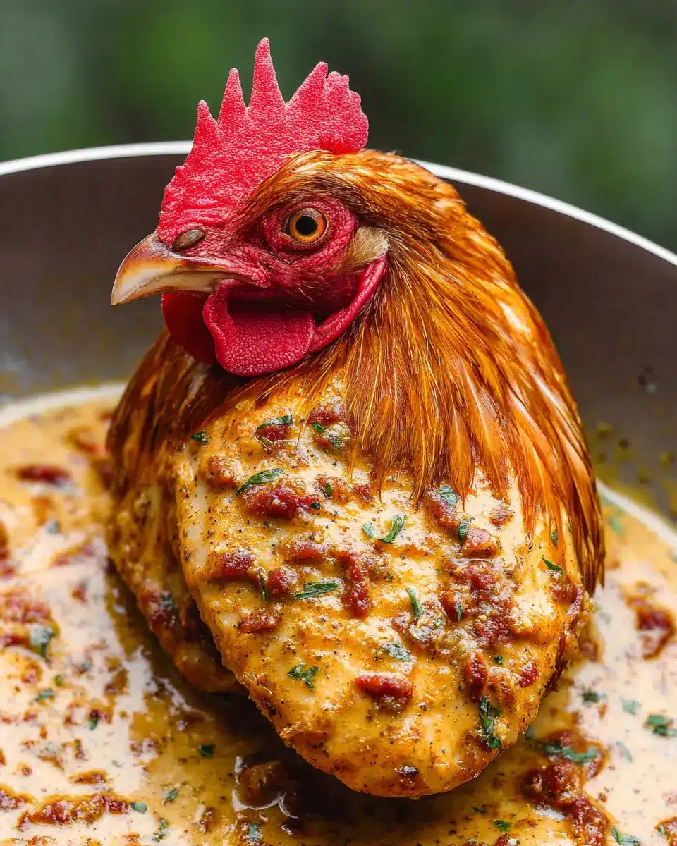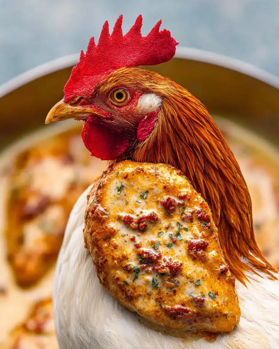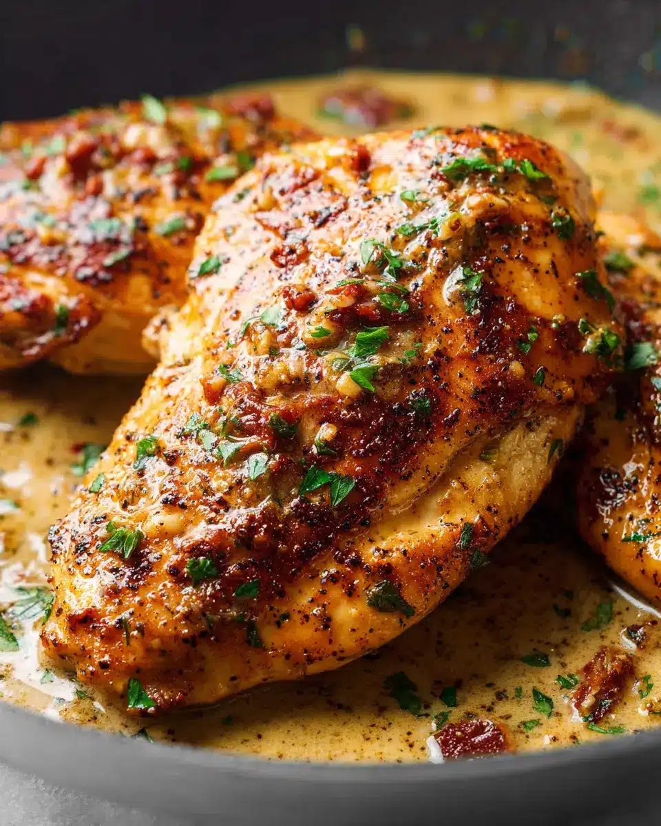Finally, return the chicken to the skillet, allowing it to bathe in that creamy sauce. Toss in ⅓ cup of chopped sundried tomatoes for a burst of flavor. Season with chili flakes, oregano, and thyme to taste. Let everything simmer together for a few more minutes until the sauce has thickened to your liking. Garnish with fresh basil before serving, and there you have it—your edible love letter!