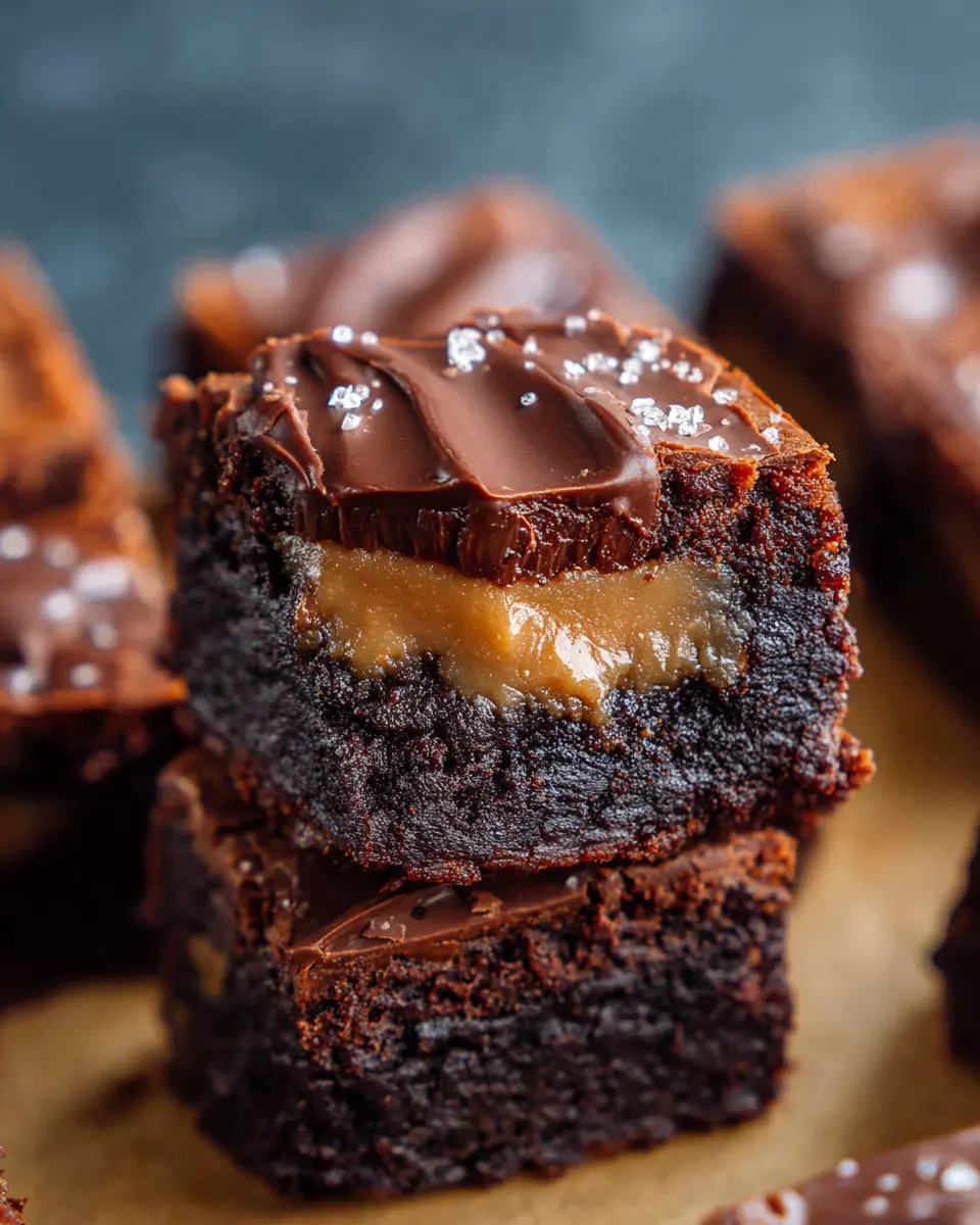 Once everything is cool, it’s assembly time! Pour the caramel over the cooled brownie layer and spread it evenly. Then, pour the chocolate ganache over the caramel. Big tip: sprinkle some flakey sea salt on top for that perfect finishing touch. Let everything set for a bit before slicing into those Millionaire Brownies. Enjoy!