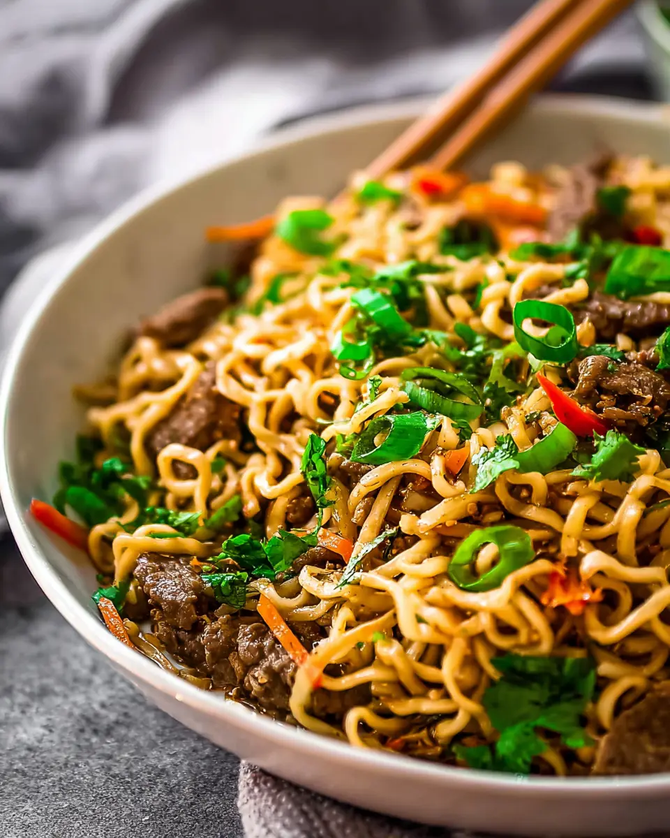 Once prepped, your meal comes together in just 15 minutes! Cooking the beef and veggies while the noodles boil ensures everything is ready to toss together for maximum flavor.