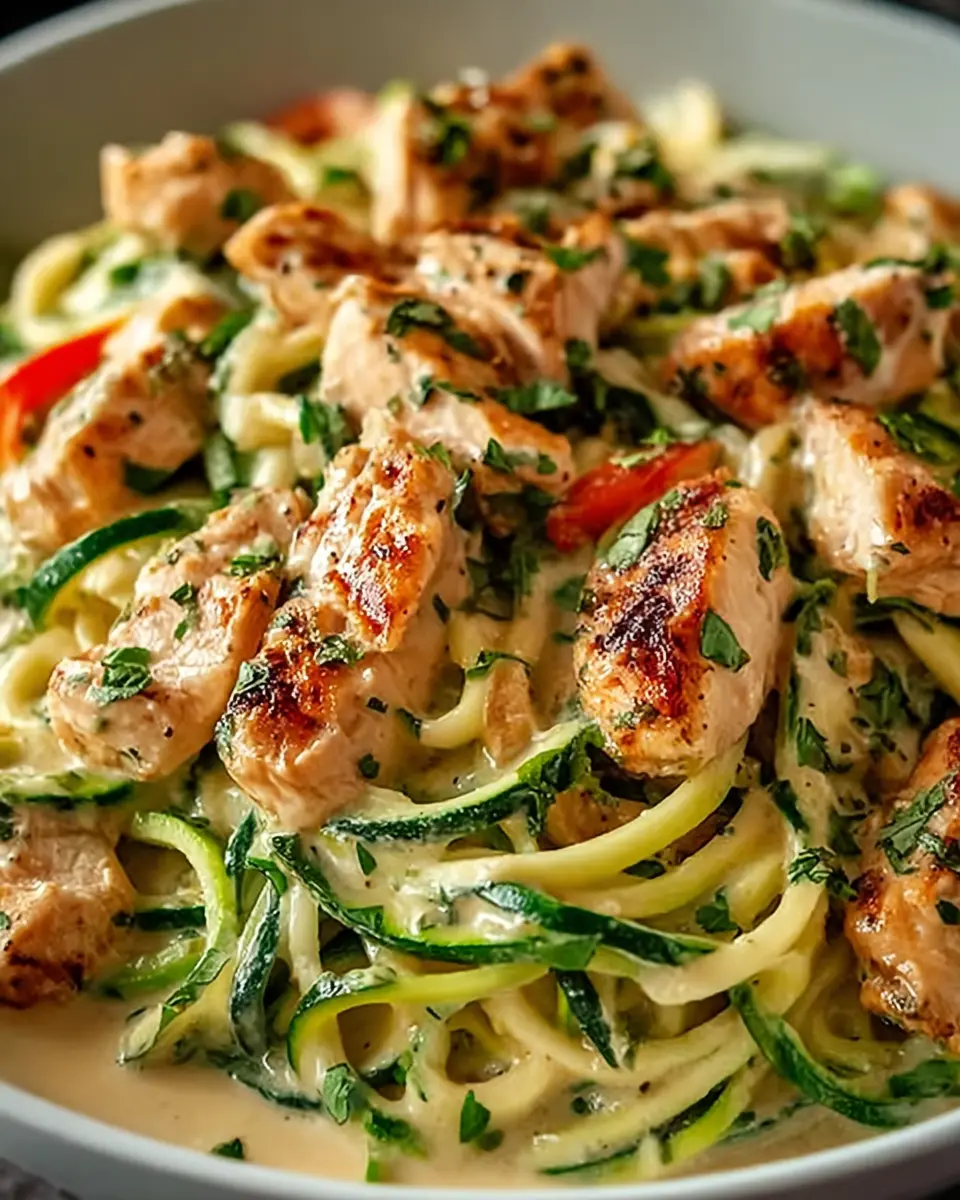 - Combine Ingredients: Add the cooked chicken back into the skillet along with the zucchini noodles. Toss gently to coat the noodles and chicken in the creamy sauce, cooking for an additional 2-3 minutes until the noodles are heated through.