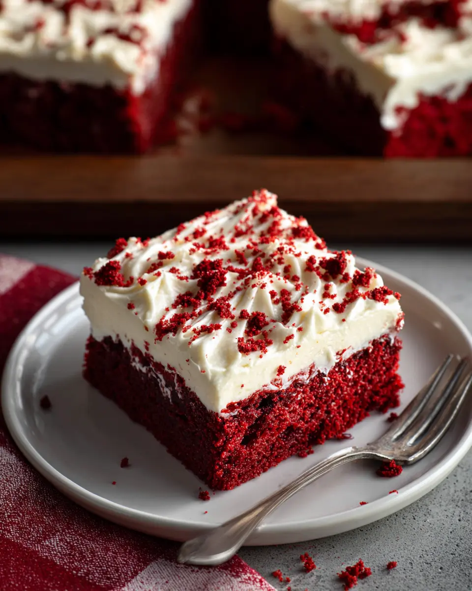 - 1 box red velvet cake mix prepared in a 9x13-inch pan