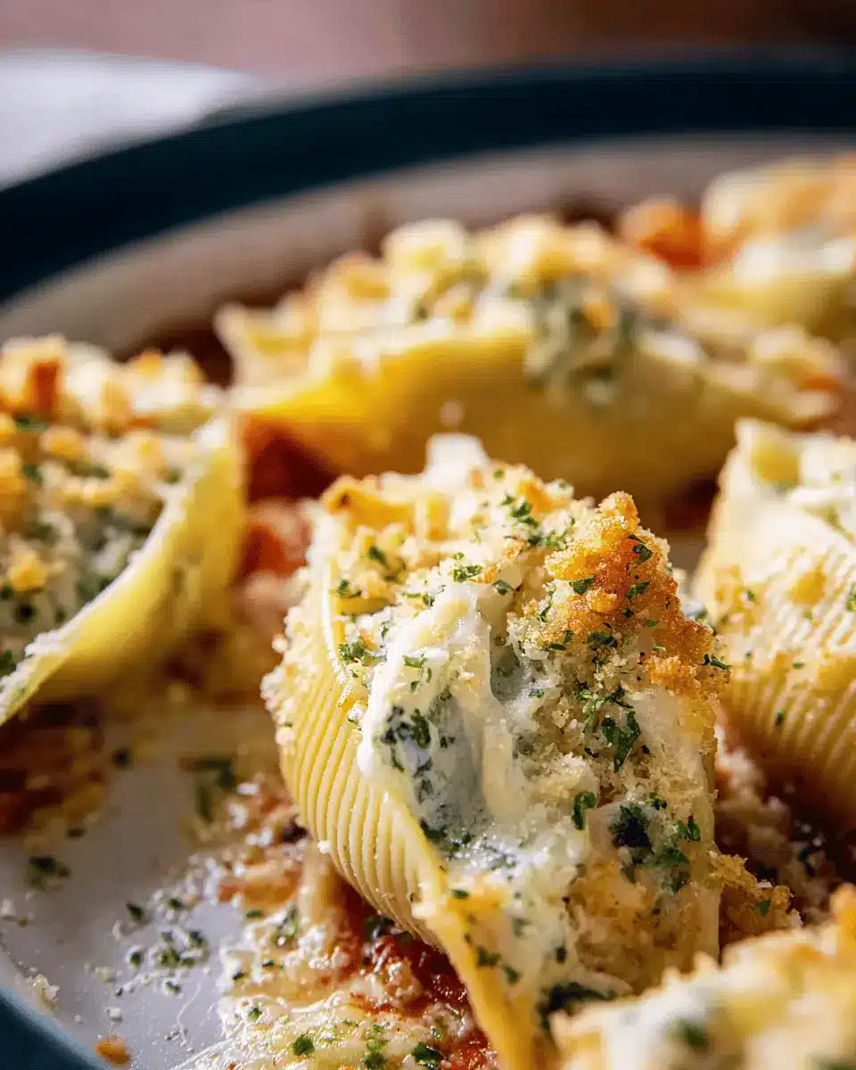 Finally, pour the remaining béchamel on top of the shells and sprinkle with 1 cup of panko breadcrumbs mixed with 2 tablespoons of melted butter. Bake in the preheated oven for about 25 minutes, or until heated through. For a perfect finishing touch, switch to the broiler briefly to make the crumbs golden and crispy. Once out of the oven, sprinkle with fresh parsley, and enjoy your seafood stuffed shells!