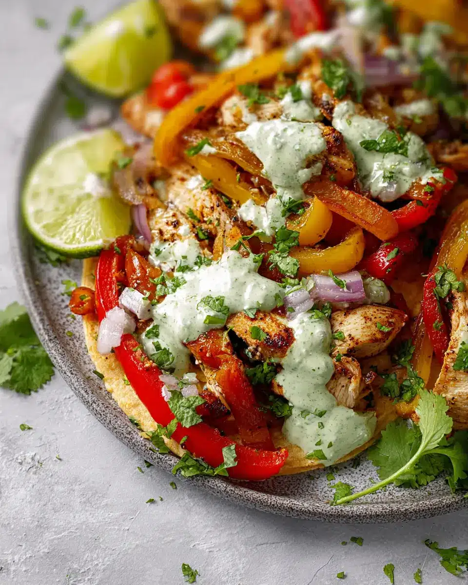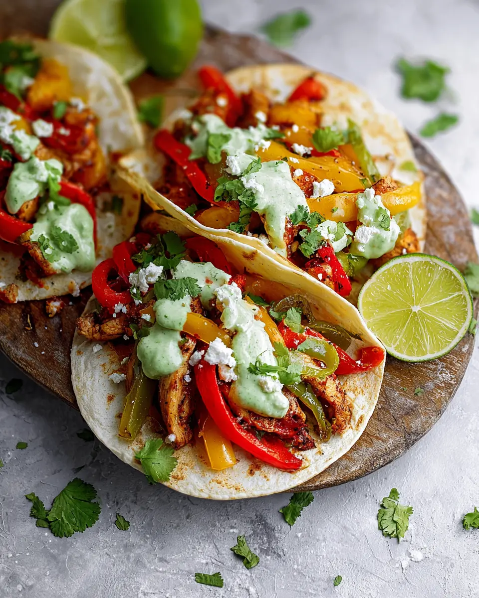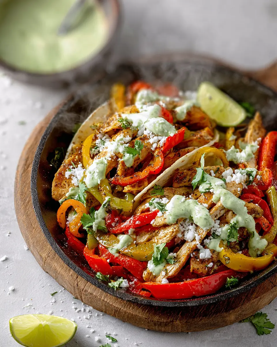 You’re now ready to serve! Load your tortillas with the skillet chicken fajitas, top them with the Creamy Jalapeño Verde Sauce, and garnish with cotija cheese, lime juice, and fresh cilantro for a stunning finish. Enjoy your culinary creation!