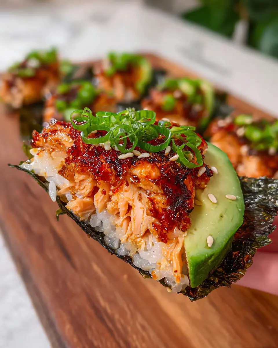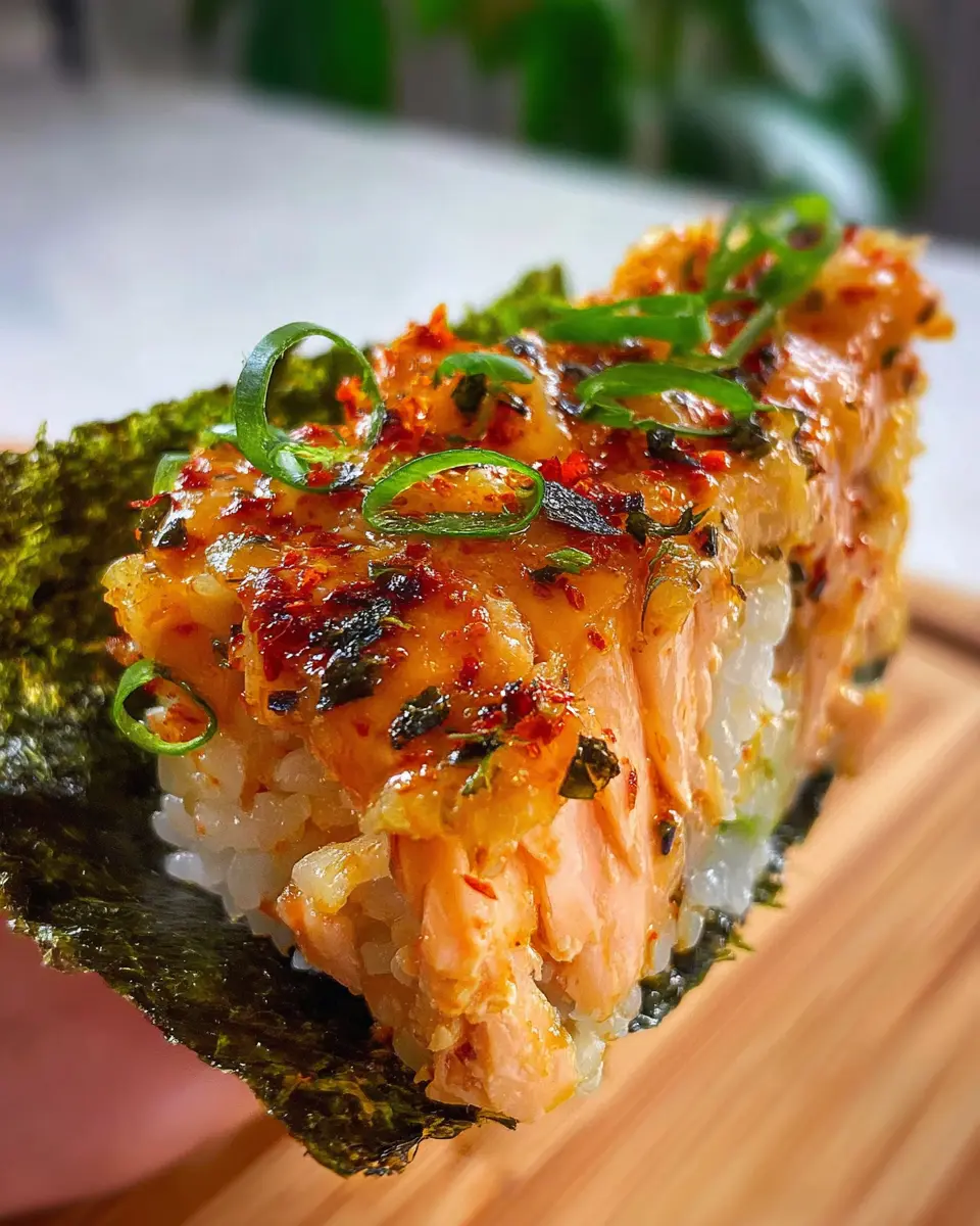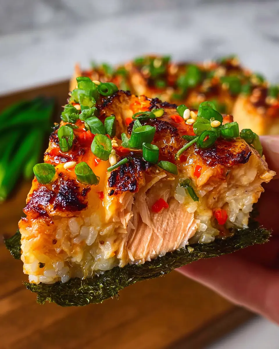 - Remove your spicy salmon sushi bake from the oven and sprinkle it with sliced green onions for a fresh, bright garnish.