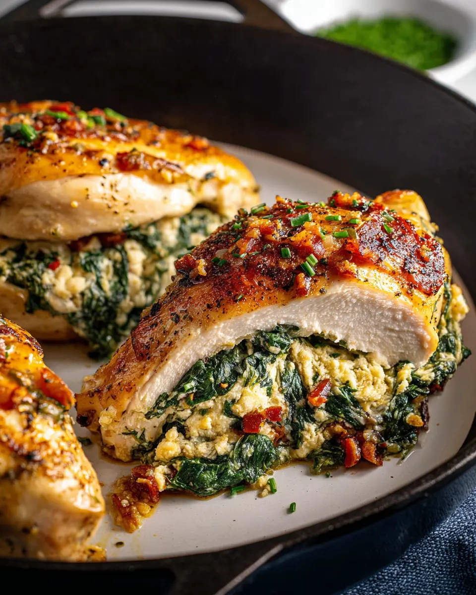 After removing them from the skillet, give the chicken a few minutes to rest. This step enhances the juiciness. Serve hot, adorned with the remaining walnuts, some pretty parsley, and extra sun-dried tomatoes. Enjoy your beautiful spinach stuffed chicken breast as a showcase for your culinary prowess!