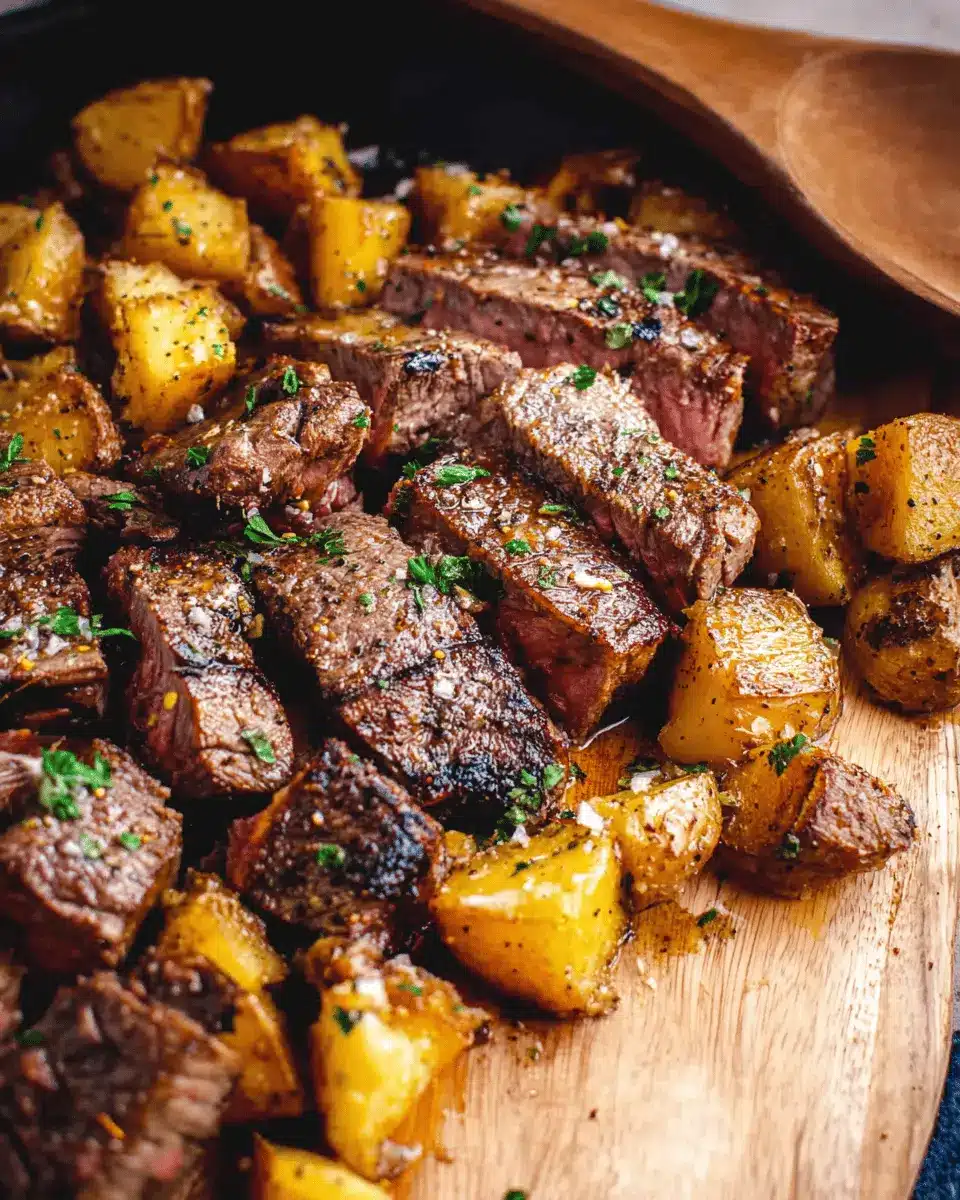 Add your personal touch with different seasonings or vegetables. For a twist, mix in smoked paprika or ranch seasoning for a flavor boost. Feel free to swap out Yukon Gold potatoes for sweet potatoes or even add some colorful bell peppers and onions to the skillet for extra nutrition and taste. The beauty of Garlic Butter Steak Bites and Potatoes lies in its versatility—let your creativity shine in the kitchen!