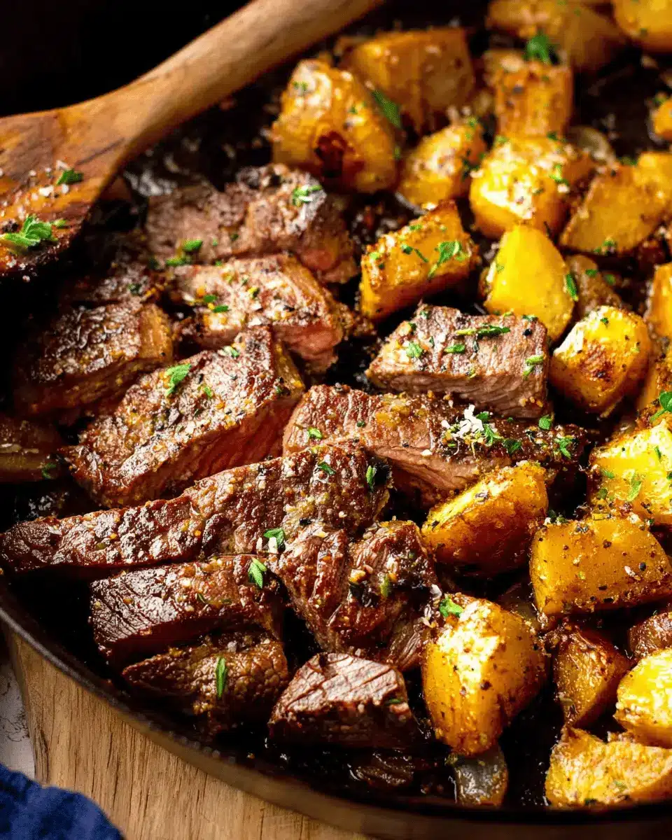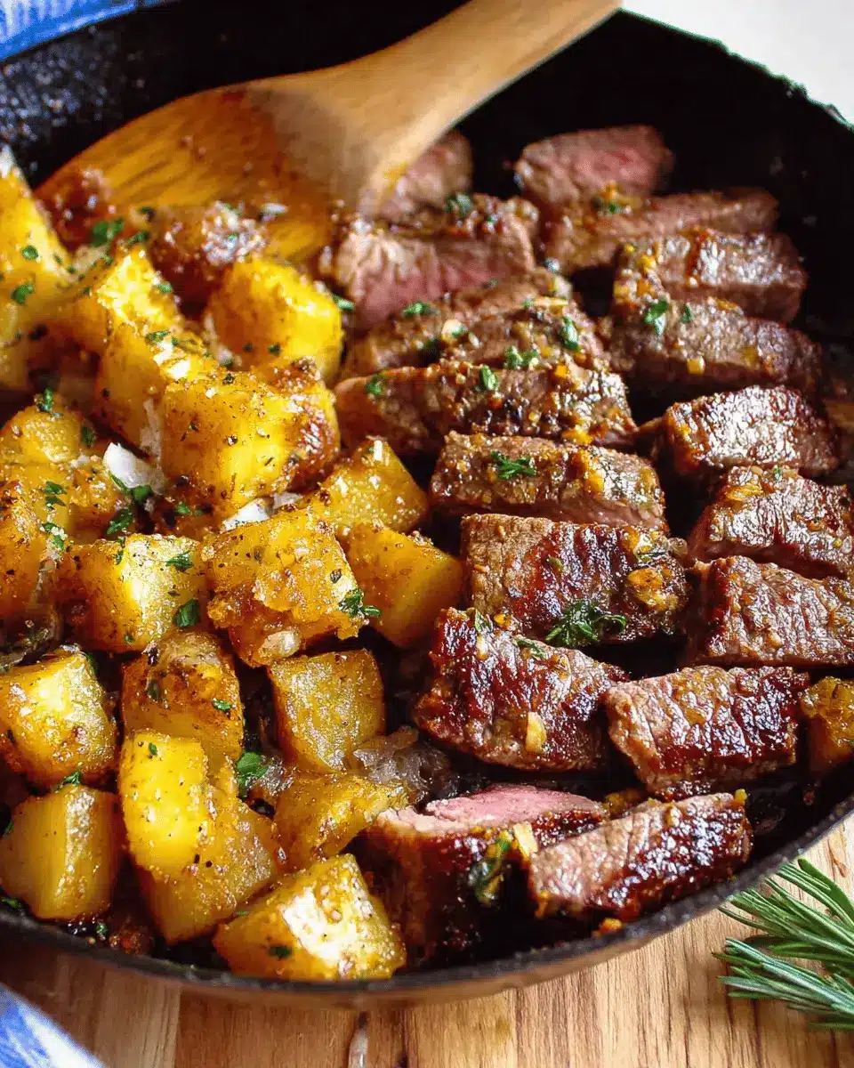Once your steak is beautifully seared, it’s time to combine everything. Return the cooked potatoes to the skillet and mix with the steak bites. Pour in 4 cloves of minced garlic, 1 teaspoon dried rosemary, and 1 teaspoon dried oregano to enhance those steak and potatoes flavors. This fragrant garlic butter sauce will elevate your dish to a whole new level.
