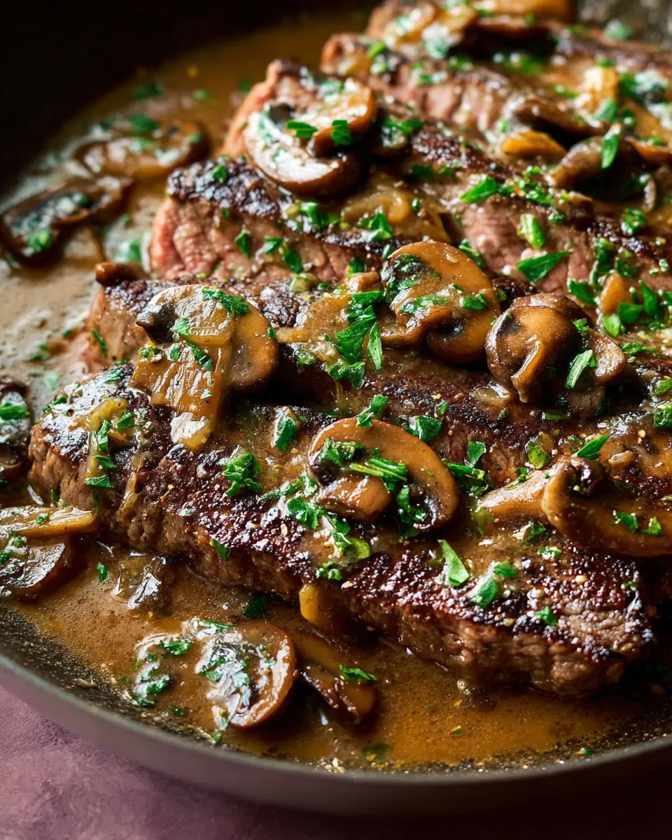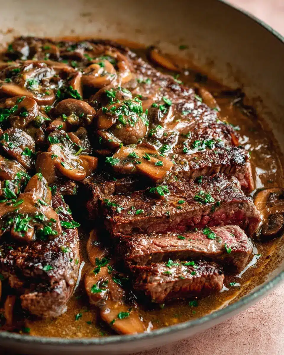 Finally, return the steak to the pan, allowing it to warm up slightly in the sauce for about 2–3 minutes. Keep an eye on that internal temperature; you want to avoid going past 145°F. To add a fresh touch, sprinkle with chopped chives before serving. This dish pairs wonderfully with mashed potatoes or a fresh side salad for a balanced meal.