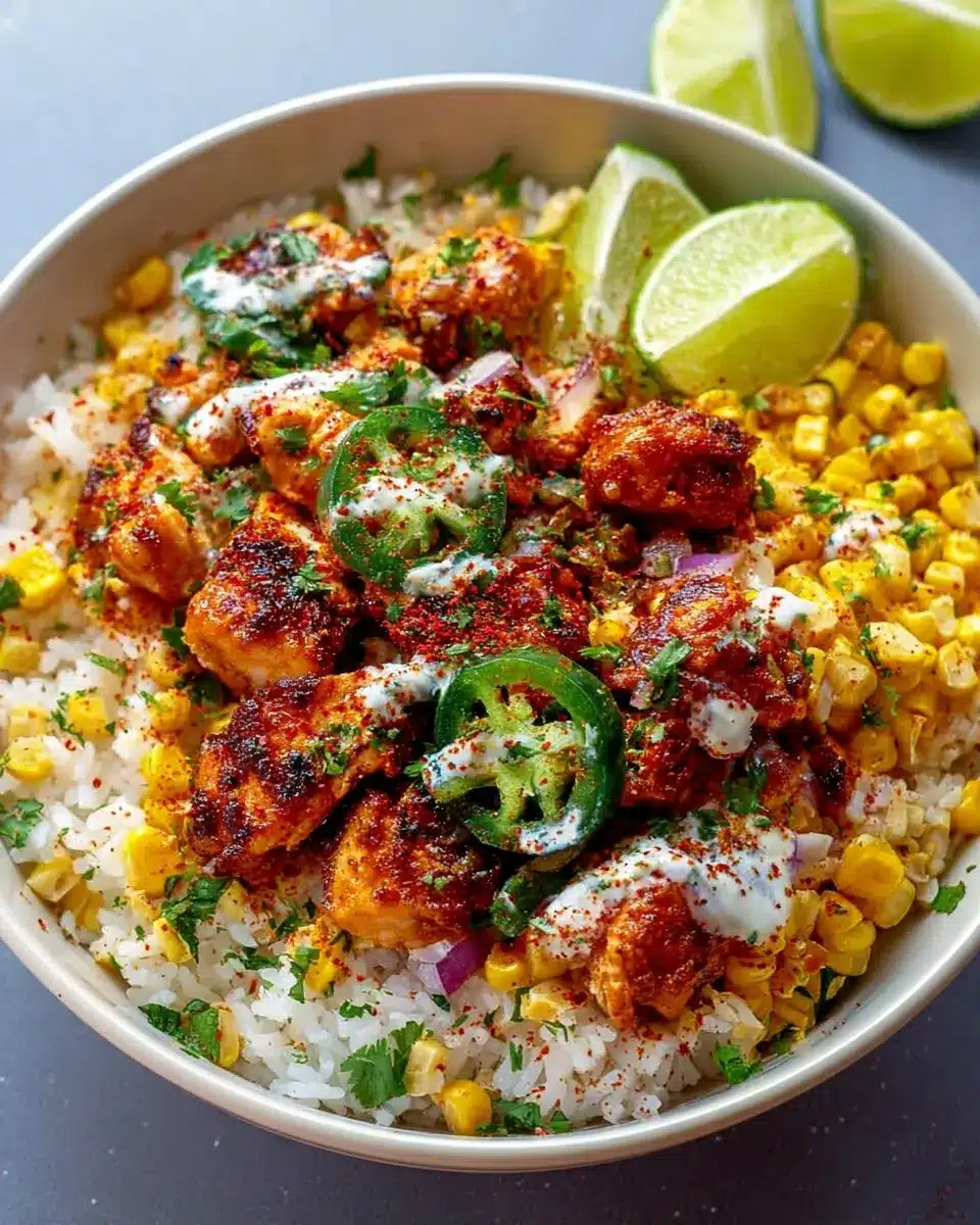 To make your street corn chicken rice bowl stunning, layer your ingredients in a clear bowl or plate. Start with a fluffy bed of rice, then artfully arrange sliced chicken on top. Generously sprinkle with the vibrant street corn mixture and crumbled Cotija cheese. Finish with a pop of color by adding fresh cilantro. Serve lime wedges on the side to invite a squeeze of citrus right before biting in—it enhances all the flavors beautifully and adds a personal touch to each bowl.