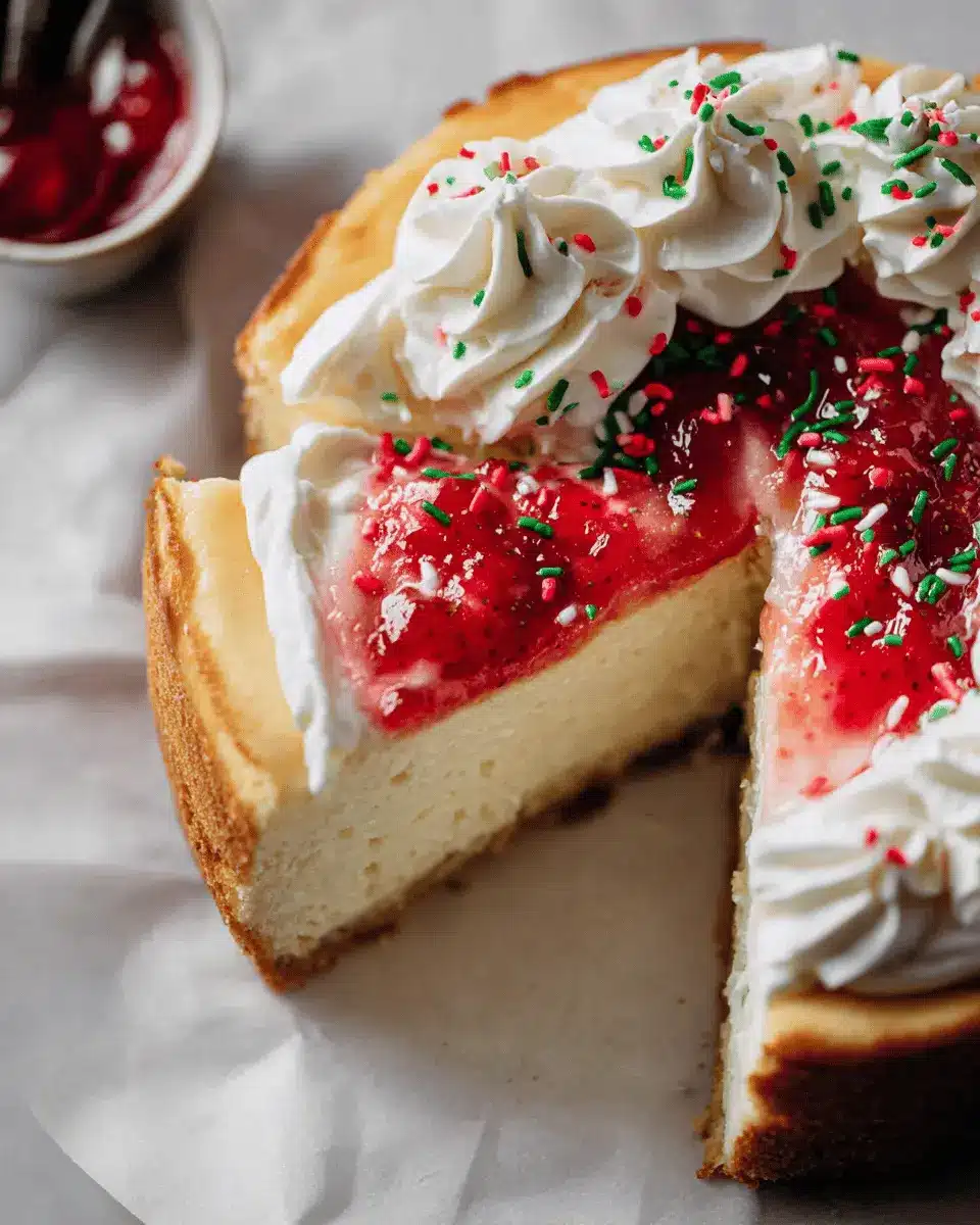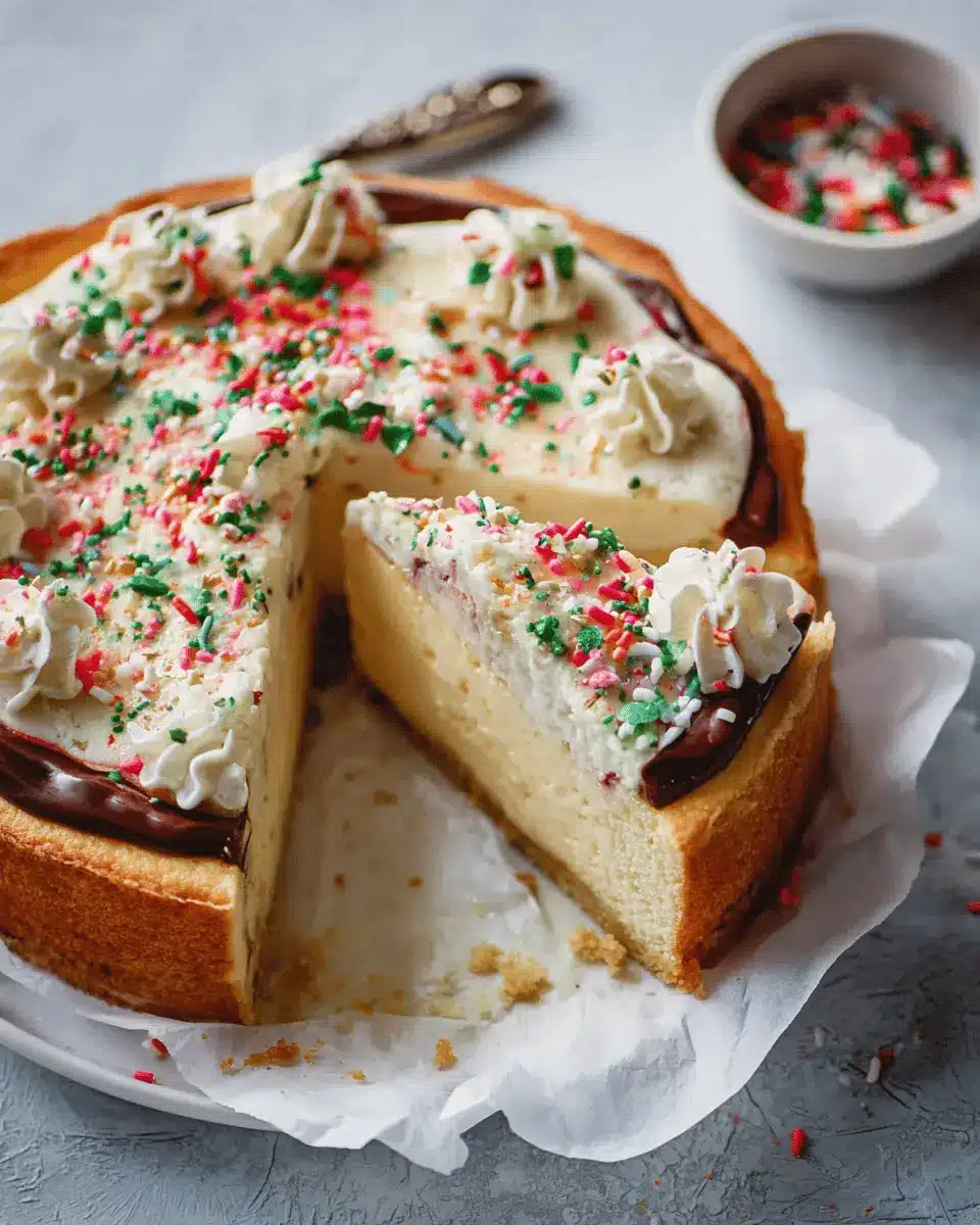 - Spread the frosting over the chilled cheesecake and don’t forget to add extra sprinkles for that festive flair!