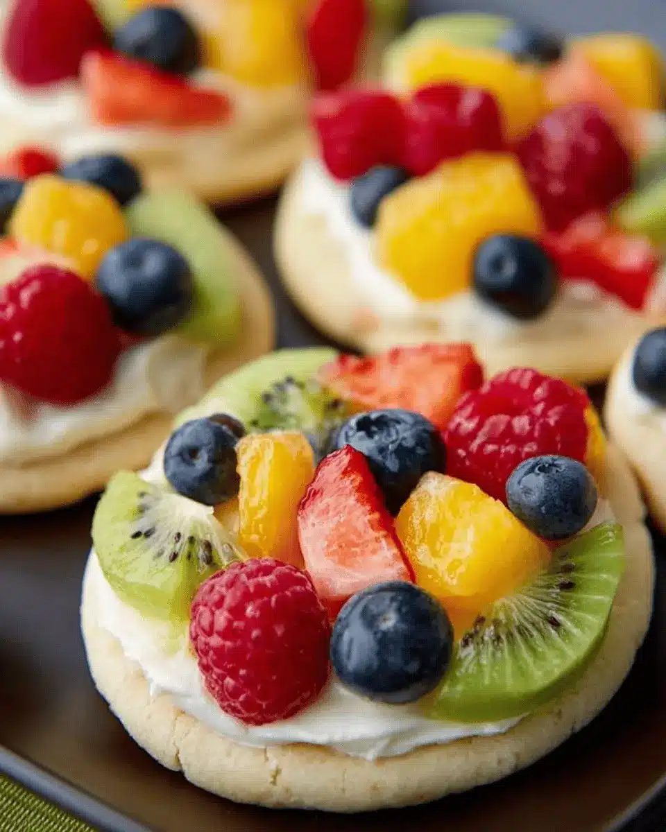 Once your cookies are completely cool, generously frost each one with your cream cheese frosting. Then comes the fun part: top them with your favorite colorful fruits! Fresh strawberries, blueberries, and kiwis work beautifully to create a vibrant display on your Sugar Cookie Fruit Pizzas.