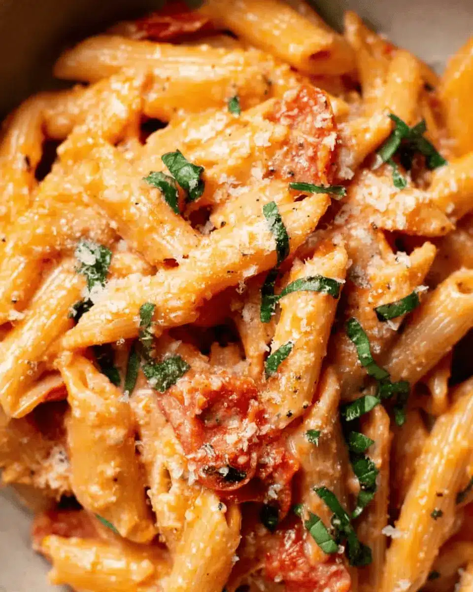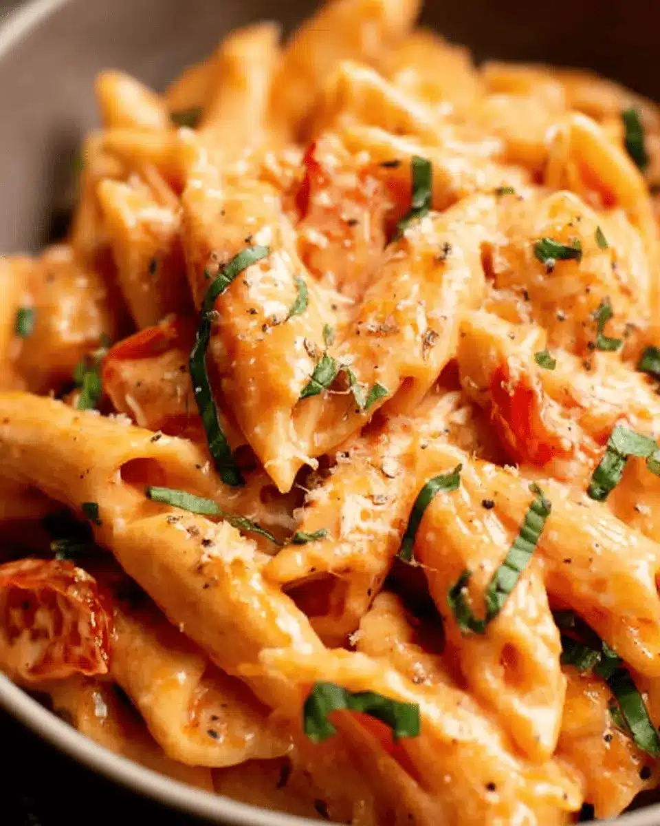 Once the pasta is cooked, drain it well. Now comes the exciting part! Toss the pasta into your creamy tomato sauce, mixing it all together until every noodle is beautifully coated. If you find the sauce too thick, a splash of hot pasta water will loosen everything up and make it even silkier.