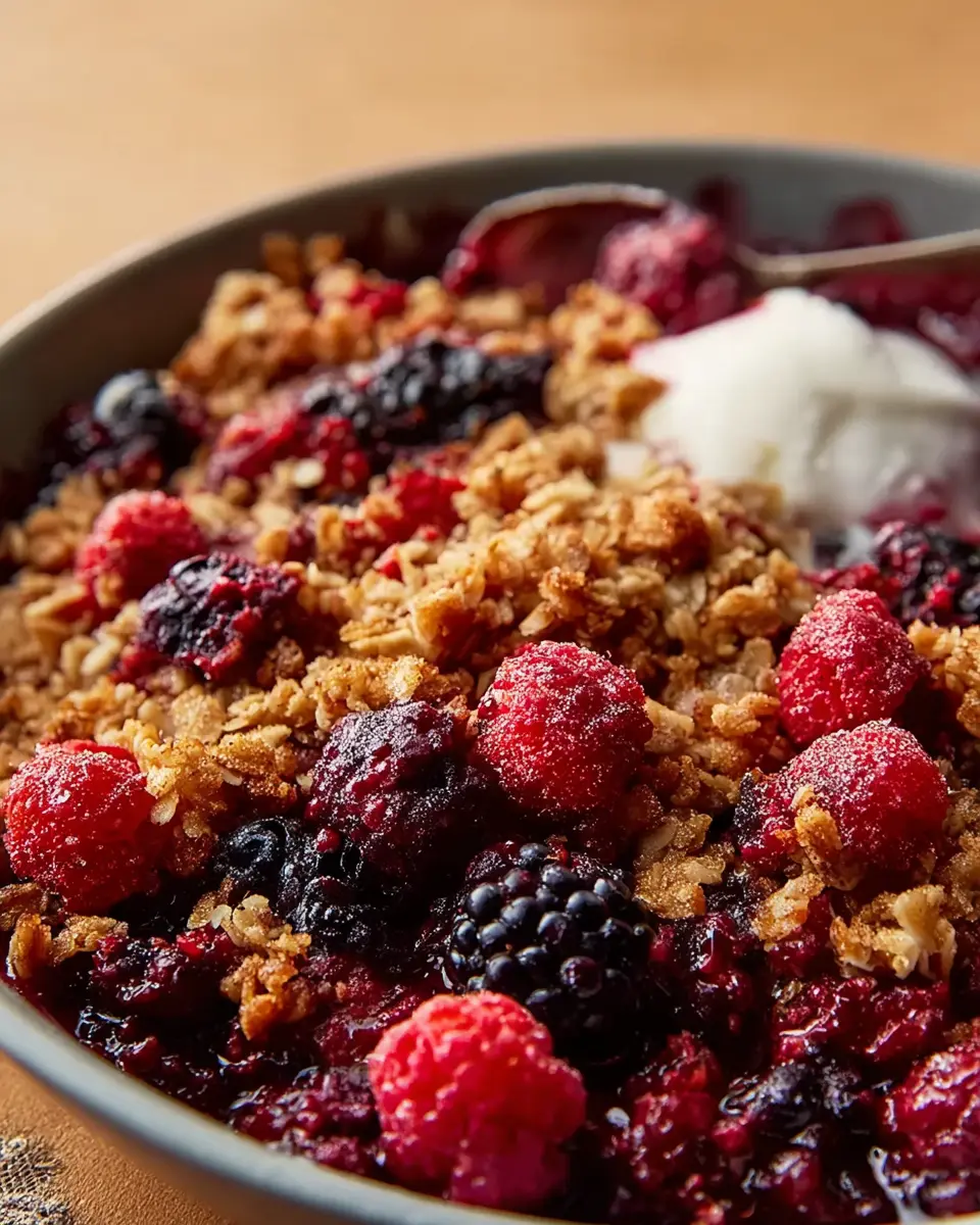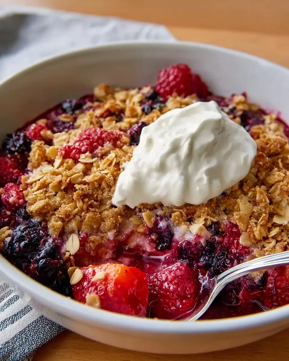 There's nothing quite like a comforting triple berry crisp to satisfy your sweet tooth. Easy to prepare and bursting with flavor, this dessert is perfect for family gatherings or cozy nights in. Top it off with some whipped cream, and you're in for a treat! Enjoy!