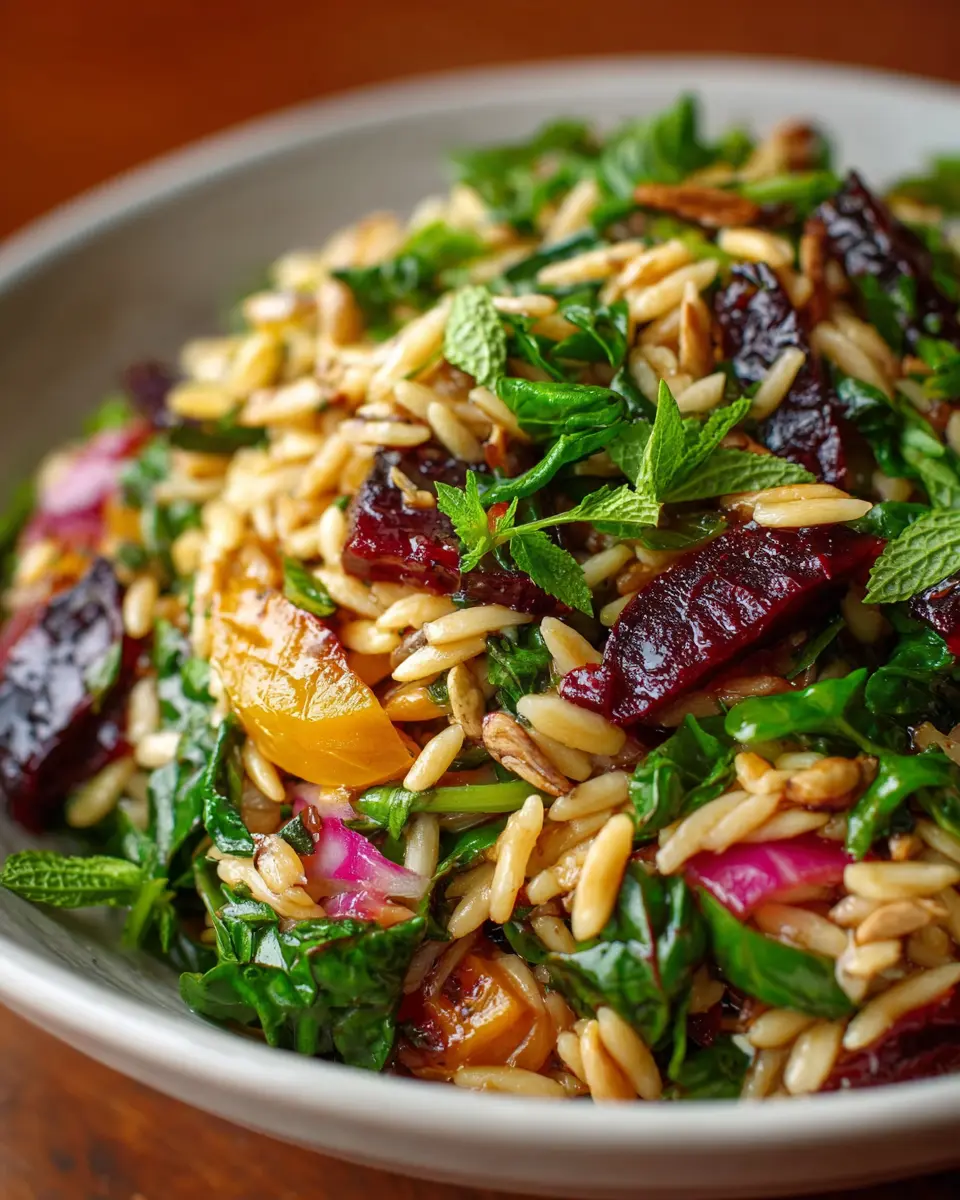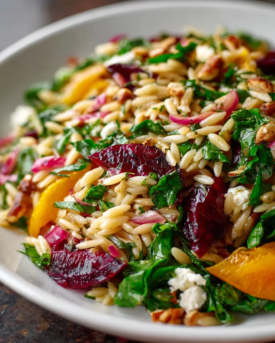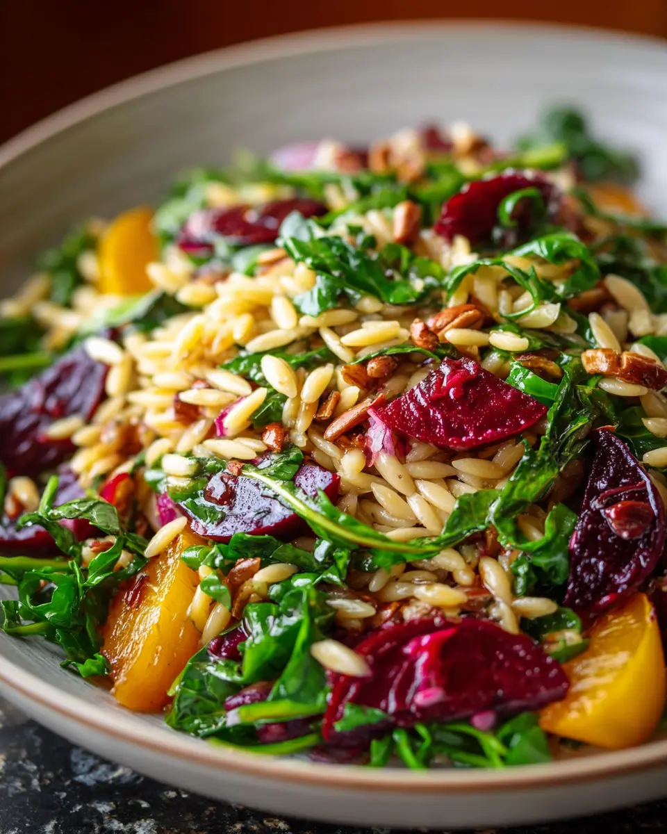 This warm orzo salad with beets & greens is not only a feast for the eyes, but also a celebration of texture and flavor. Perfect for busy weeknights or casual get-togethers, it provides a wholesome, satisfying meal. Give it a try; your taste buds will thank you!